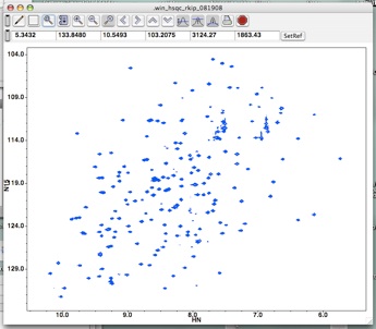 The molecule Raf Kinase Inhibitor Protein (RKIP) plays critical roles in cellular signaling related to cancer, and is a focus for Prof. Marsha Rosner’s lab at the University of Chicago’s Ben May Cancer Institute. This work includes taking nuclear magnetic resonance (NMR) spectra of RKIP, such as the 2D 1H-15N heteronuclear single quantum coherence (HSQC) spectrum shown. The HSQC provides a fingerprint for the protein, where each crosspeak